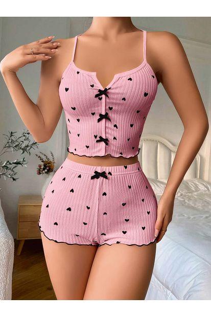 Kutulu Kurdele Detaylı İp Askılı Şortlu Kadın Gecelik Takımı