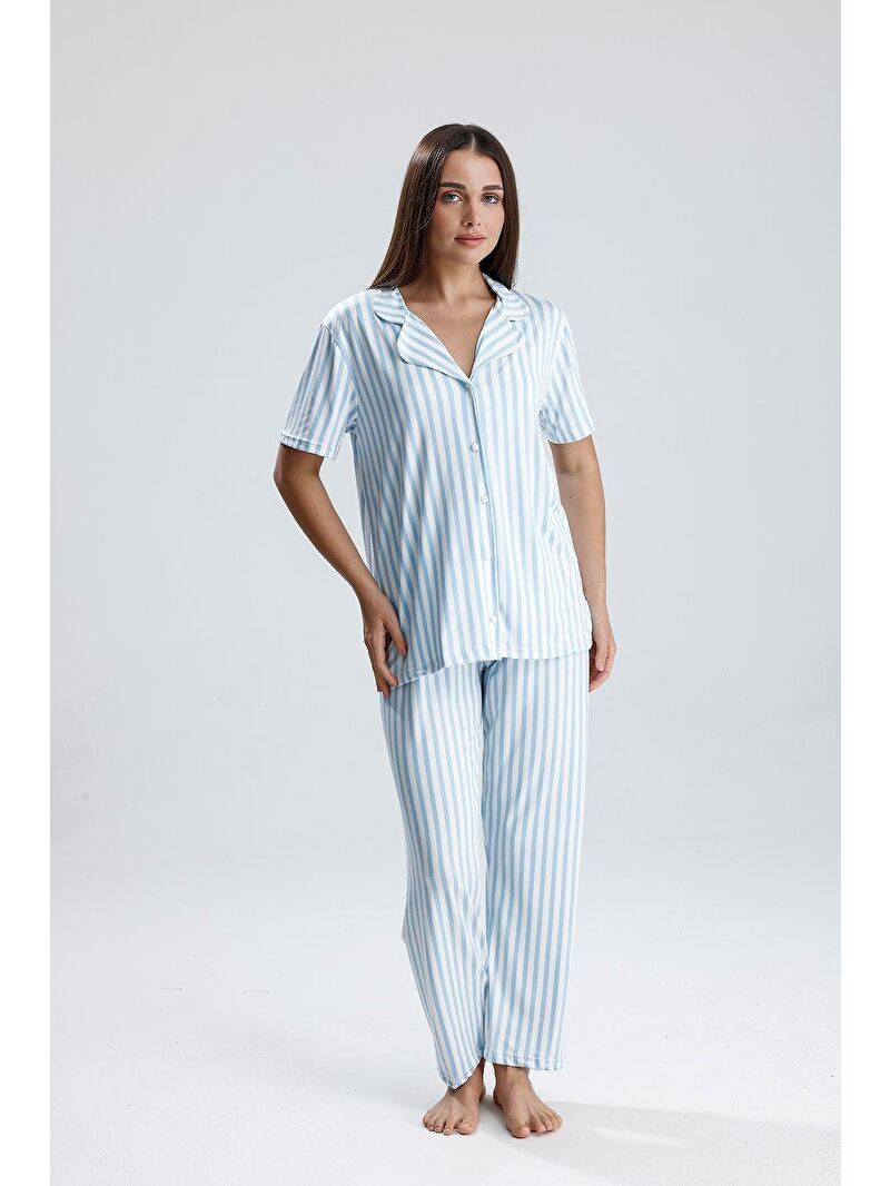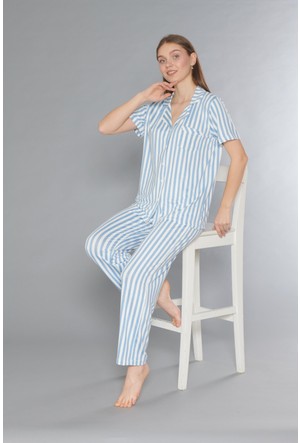 Mavera Kadın Mavi Beyaz Çizgili Kısa Kol Uzun Pijama Takımı